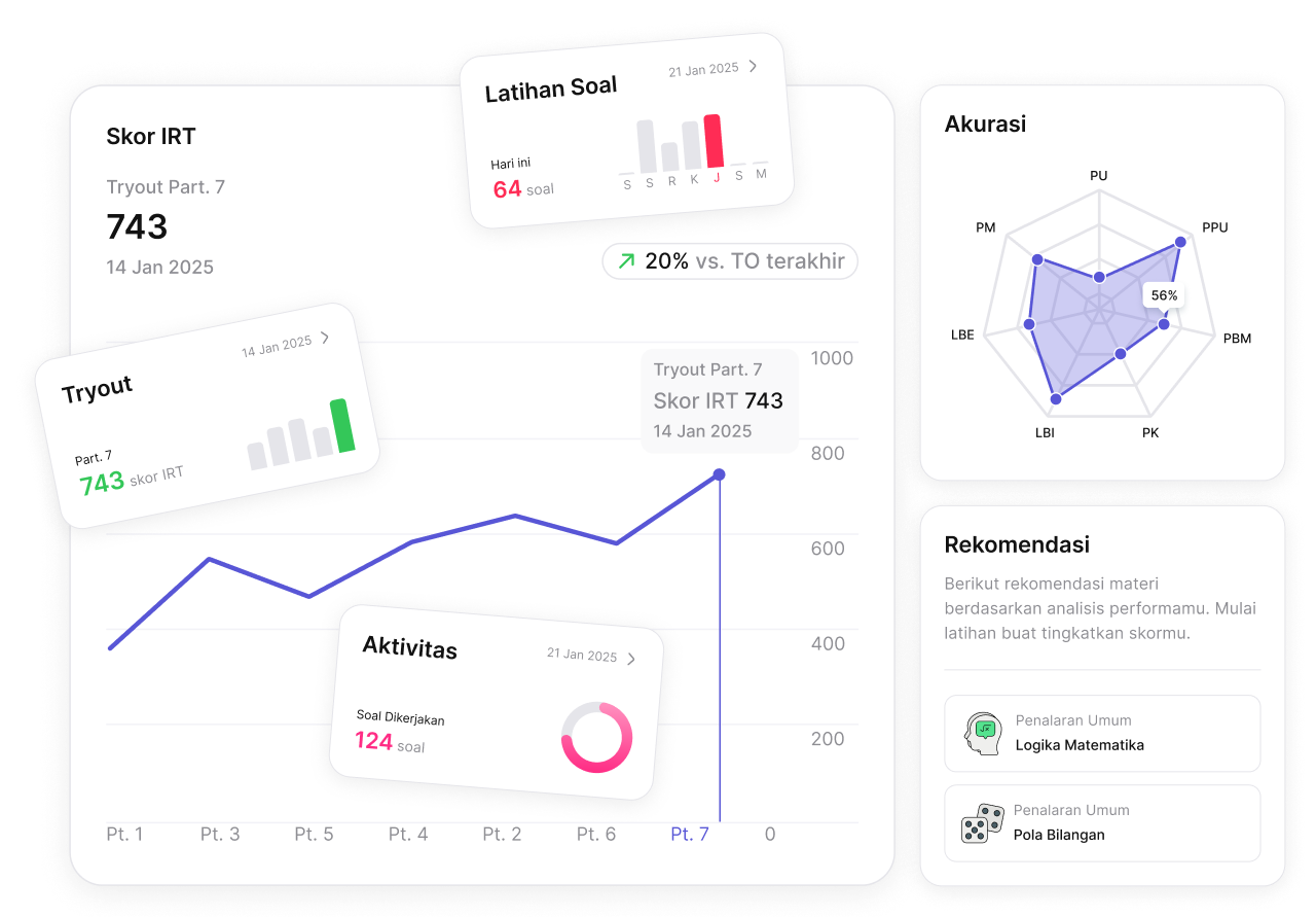 Cek Laporan SekarangRingkasan seluruh kegiatanmu—dari latihan soal, tryout, hingga waktu pengerjaan—didapatkan dalam tampilan yang mudah dipahami.